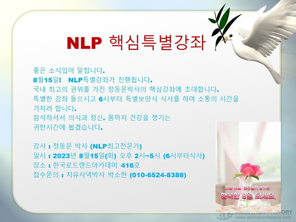 공지사항 NLP 핵심 특별강좌 작성자 관리자 작성일 2023-08-02 02:46 조회 500 뜨거운 여름날이 지속됩니다건강유의하시고 특별강좌에 여러분을 초대합니다 좋아요 1 싫어요 0 인쇄 « 로드랜드대학교 제23회 졸업식 및 학위수여식 초청장 의학최면 전문가 양성과정 개최 » 목록보기 답글쓰기 Powered by KBoard