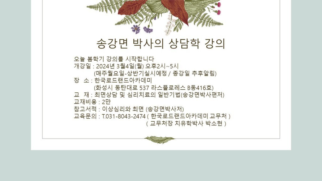 공지사항 송강면 박사의 상담학강의 시작합니다 작성자 관리자 작성일 2024-03-03 15:22 조회 422 2024년 상반기 상담학 강의 시작합니다 좋아요 1 싫어요 0 인쇄 « 송강면박사의 상담학 강의 송강면 박사의 감수성훈련 워크숍 실시 » 목록보기 답글쓰기 Powered by KBoard